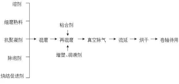 八、流延成型 流延成型又稱帶式澆注法、刮刀法,是一種目前比較成熟的能夠獲得高質(zhì)量、超薄型瓷片的成型方法,已廣泛用于獨石電容器瓷、多層布線瓷、厚膜和薄膜電路基片、氧化鋅抵押壓敏電阻及鐵氧體磁及一片等新型陶瓷的生產(chǎn)。 工藝流程: