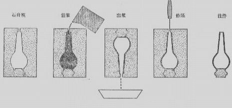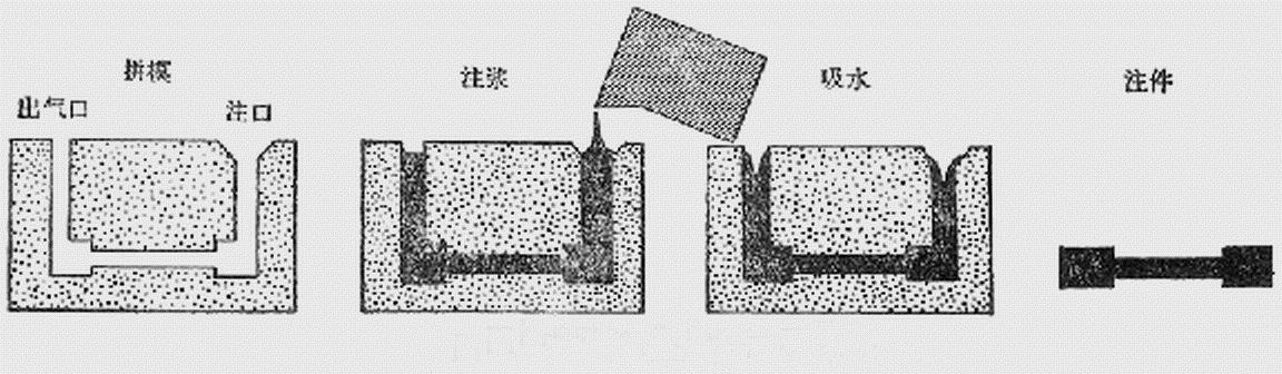 實心注漿法示意圖 工藝流程:配料加水→坯泥→注漿成型→干燥→燒制 工藝特點: 注漿成型工藝簡單,但勞動強度大,生產(chǎn)周期不長,不易實現(xiàn)自動化;且配體燒后的密度小,機械強度差,收縮、變形大,對機械強度、幾何尺寸、電氣性能要求高的新型陶瓷產(chǎn)品,一般不用此法。