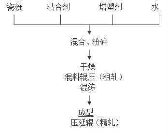 四、軋膜成型 軋膜成型是將準備好的陶瓷粉料,拌以一定量的有機粘合劑(如聚乙烯醇等)和溶劑,通過粗軋和精軋成膜片后再進行沖片成型。 工藝流程: