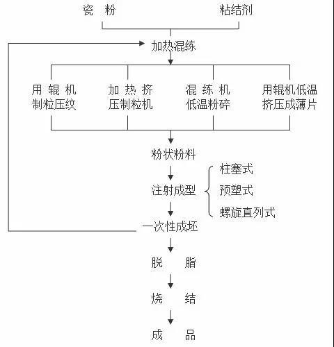 注射成型示意圖 注射成型是將瓷粉和有機粘結(jié)劑混合后,經(jīng)注射成型機,在130~300℃溫度下將瓷料注射到金屬模腔內(nèi)。待冷卻后,粘結(jié)劑固化,便可取出毛皮而成型。