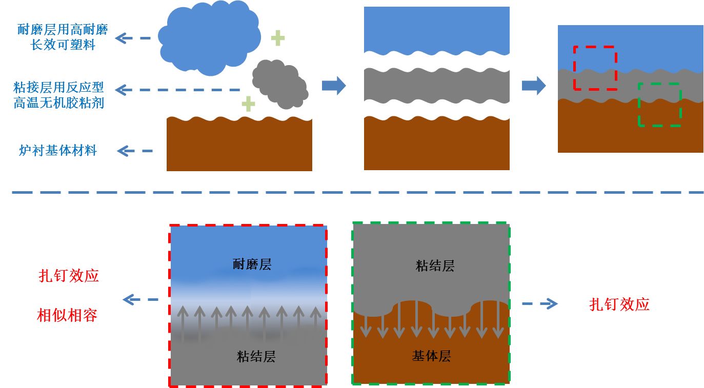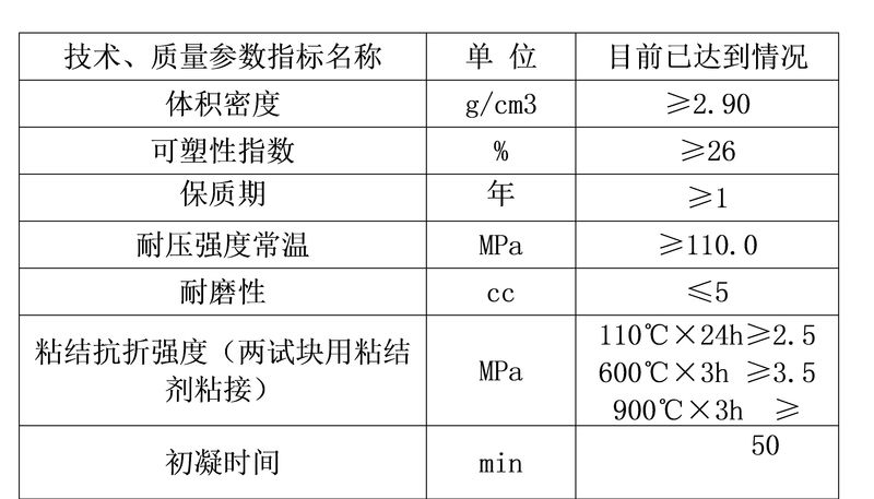 四、產(chǎn)品技術(shù)優(yōu)勢 1)保存期:其保存期可達(dá)12個(gè)月以上,而目前的傳統(tǒng)磷酸鹽可塑料保存期不到3個(gè)月; 2)固化可控性:固化時(shí)間在30~80分鐘內(nèi)可控。 3)耐磨性和強(qiáng)度:采用復(fù)合結(jié)合劑,在固化過程中兩者都會(huì)發(fā)生自身聚合,形成復(fù)雜的立體網(wǎng)狀的大分子復(fù)合結(jié)構(gòu),進(jìn)一步提高材料的強(qiáng)度和耐磨性。復(fù)合的強(qiáng)度和耐磨性比傳統(tǒng)材料高出30%,綜合使用壽命達(dá)1年以上。 4)結(jié)合強(qiáng)度:產(chǎn)品采用梯度復(fù)合層,利用粘接層/基體材料的扎釘效應(yīng)和粘接層/耐磨層中的溶膠增強(qiáng)化學(xué)結(jié)合相互交聯(lián),互相嚙合的界面特性,彌補(bǔ)傳統(tǒng)過渡層的界面性能缺陷,使過渡層在高溫使用的過程中不易脫落及損毀,延長修補(bǔ)爐襯面的整體使用壽命。