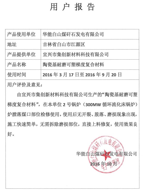 一、企業(yè)簡介 宜興市集創(chuàng)新材料科技有限公司成立于2015年12月21日,是由武漢科技大學(xué)聯(lián)合興貝公司共同組建的“生產(chǎn)服務(wù)型”高科技新材料研發(fā)生產(chǎn)服務(wù)性公司,主要定位于CFB鍋爐防磨損檢修工程耐火材料的研發(fā)及應(yīng)用。“陶瓷基耐磨可塑梯度復(fù)合材料”產(chǎn)品的開發(fā),取代CFB鍋爐內(nèi)襯檢修的傳統(tǒng)方法,實(shí)現(xiàn)CFB鍋爐檢修“快”“好”“省”的應(yīng)用效果,為CFB鍋爐的穩(wěn)定運(yùn)行提供了有力保障,避免因停爐檢修造成的重大經(jīng)濟(jì)損失。