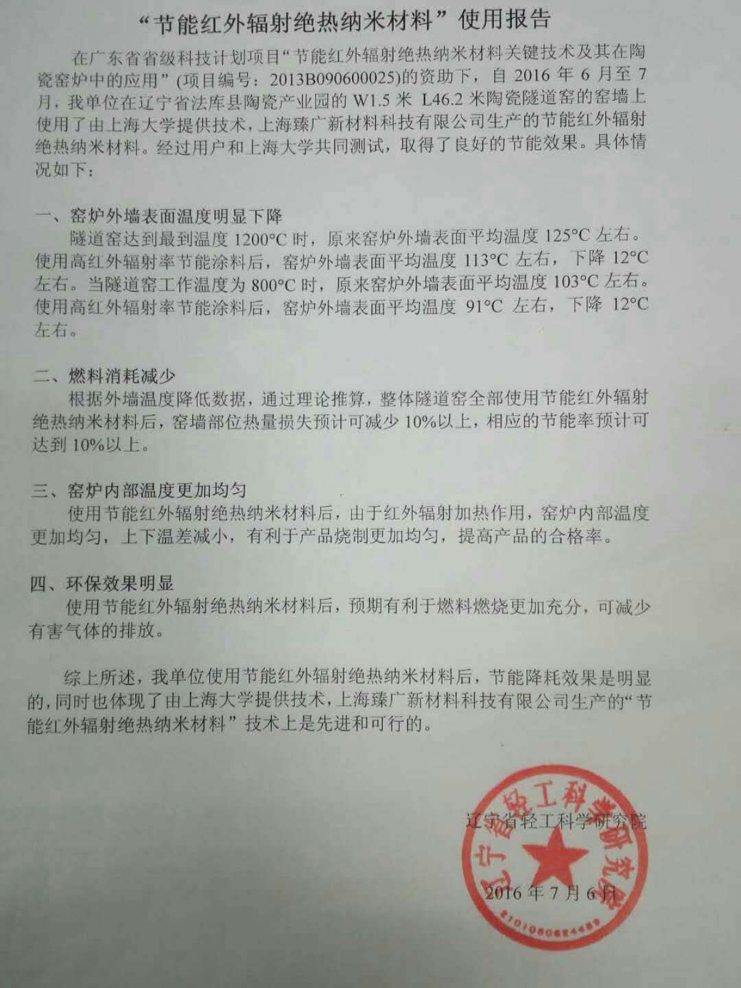 溫度分布均勻,可根據(jù)客戶要求選用波長為3~2000微米不同波段的涂料。 四、項目亮點: 1、上海大學“功能材料實驗室”研發(fā)。 2、系列產(chǎn)品已量產(chǎn),運輸方便,供貨穩(wěn)定。 3、已有多處產(chǎn)品使用實例,反響良好,有專業(yè)檢測、使用報告佐證。
