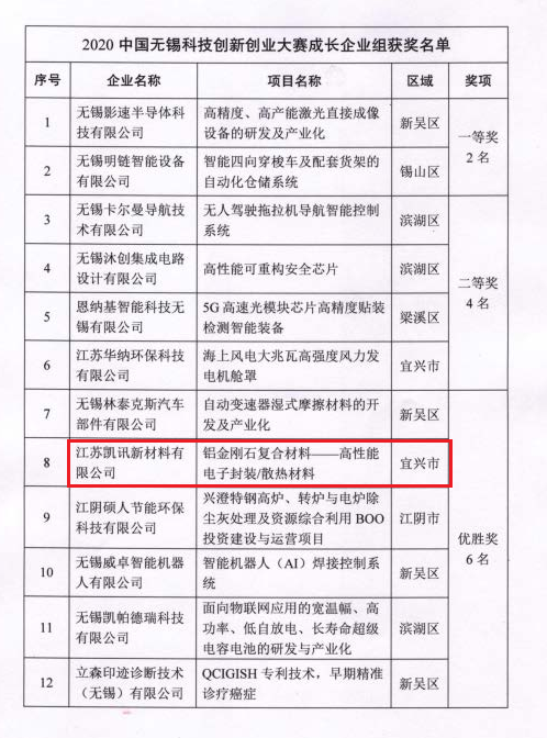 8月舉辦的中國(guó)無(wú)錫科技創(chuàng)新創(chuàng)業(yè)大賽暨第六屆蘇南全球創(chuàng)客大賽新材料行業(yè)賽,凱訊新材料以“鋁金剛石復(fù)合材料——高性能電子封裝/散熱材料”項(xiàng)目參賽,從真空高壓粉末壓鑄技術(shù)的開(kāi)發(fā)、鋁金剛石應(yīng)用的技術(shù)難點(diǎn)著手,介紹鋁金剛石材料大規(guī)模產(chǎn)業(yè)化應(yīng)用的實(shí)踐性。終,該項(xiàng)目獲得成長(zhǎng)企業(yè)組優(yōu)勝獎(jiǎng)。