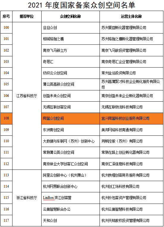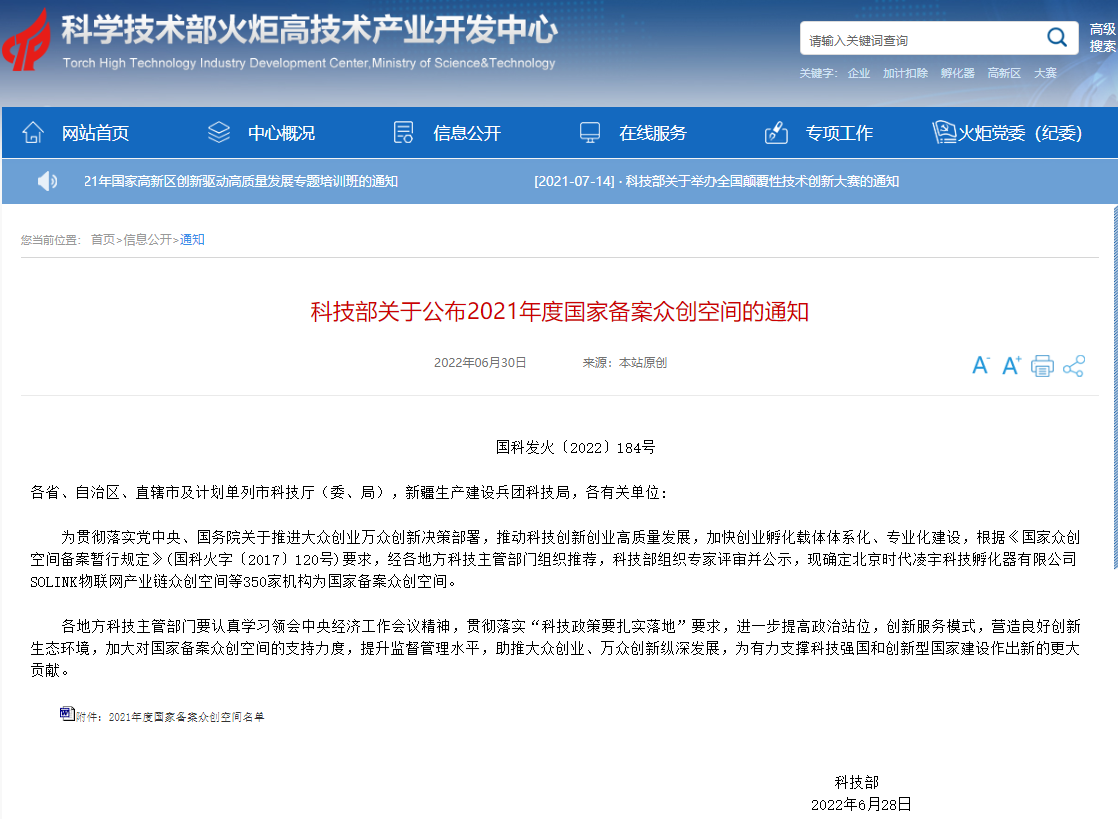 6月30日,《科技部關(guān)于公布2021年度國家備案眾創(chuàng)空間的通知》國科發(fā)火[2022]184號發(fā)布,陶譽科創(chuàng)順利通過前期評審和備案公示,正式成為國家眾創(chuàng)空間。